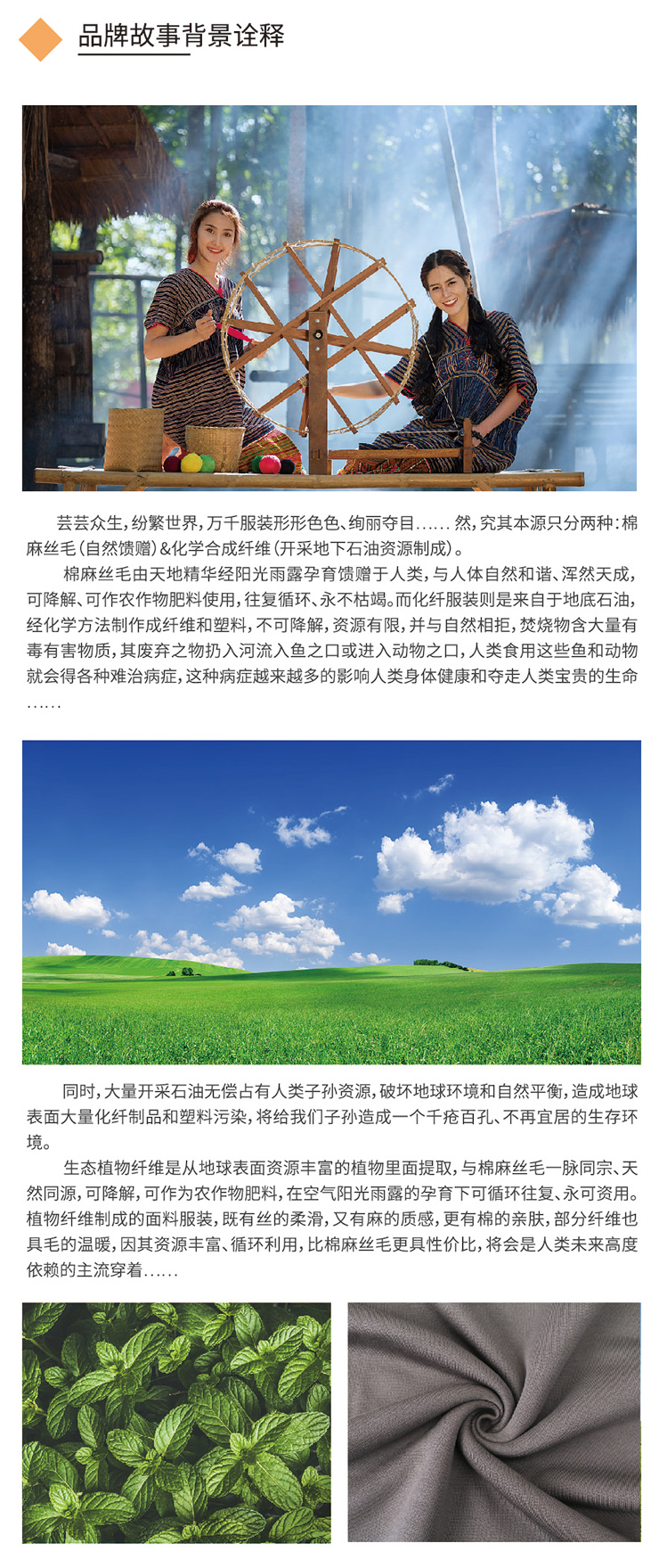 一木生態紡織產品應時代需求以及人們對天然環保服裝的渴求而誕生公司以蘇州生態工程技術研究中心為基地以一木生態紡織品科技產業園為依托,以研發、生產、銷售(電子商務平臺及跨境電商)新型功能性生態紡織產品為己任,產品全部采用天絲、莫代爾、竹纖維、玉米纖維、玫瑰、薄荷等新型纖維素纖維(植物纖維)。創新之道,本在惠人,一木人將永遠秉承歷史寶貴經驗,在新的時代與君開創新的紀元。